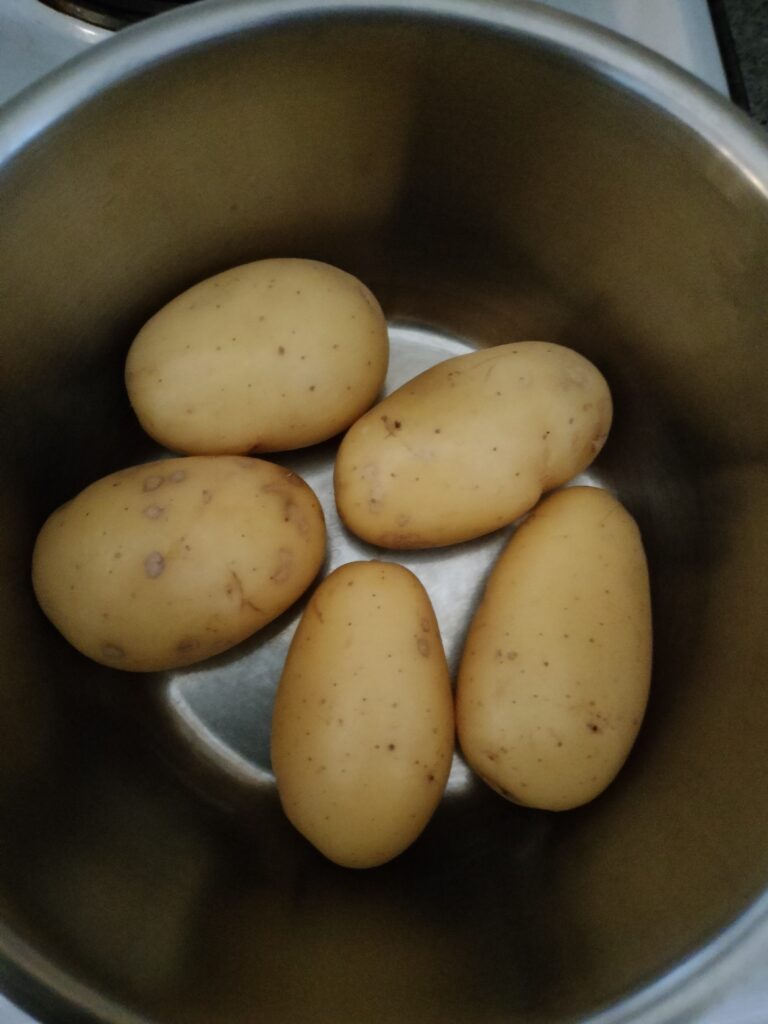 Perunoita 6-7, porkkanoita 2-3, kerma-vesiseosta, voinokare, ruohosipulia, persiljaa, suolaa, pippuria